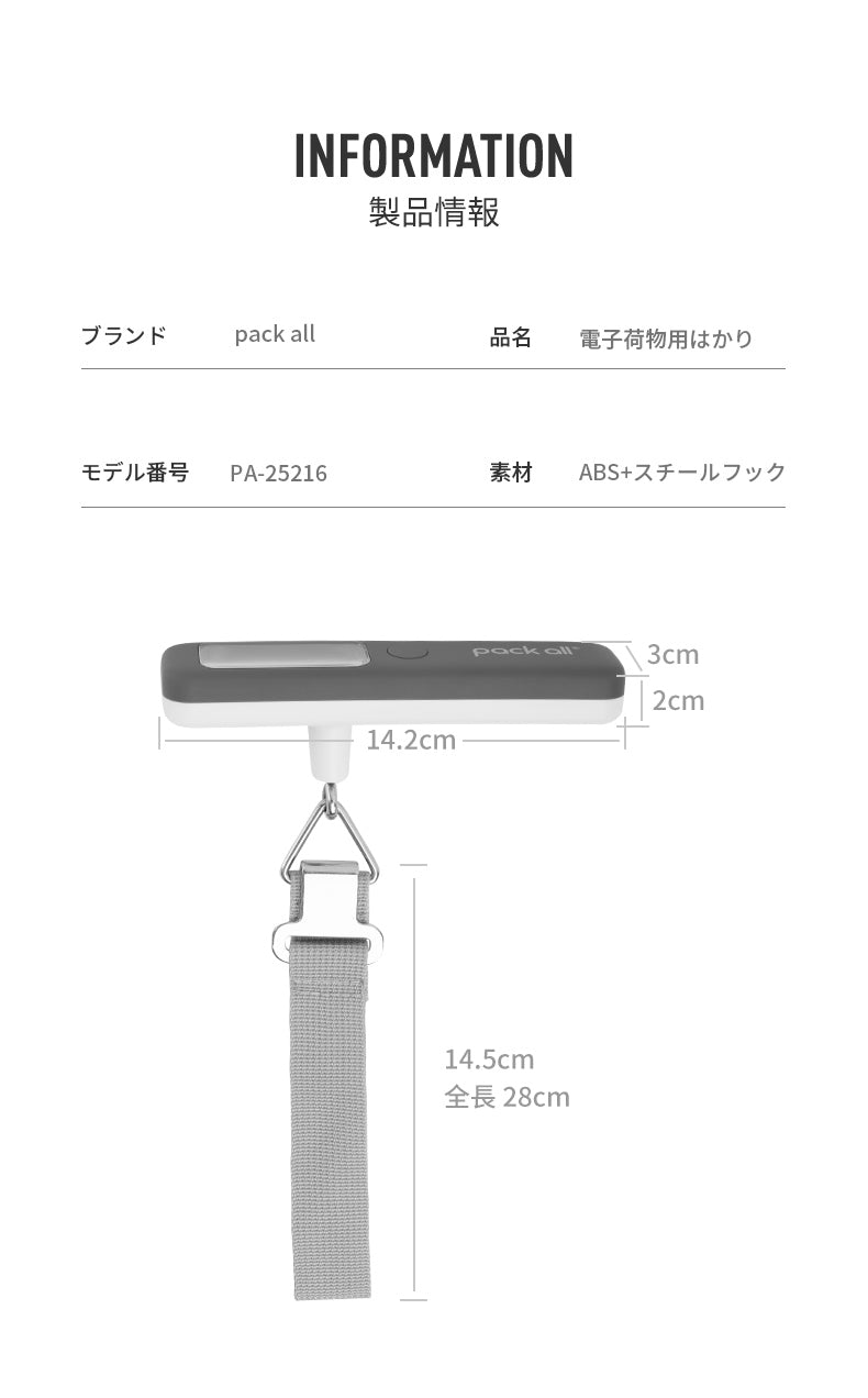 - 約14.2 x 3 x 2 cm。人間工学に基づいたスリムなデザインで、手のひらにフィットして握りやすく、重い荷物の計量時でも安定して持ち上げられます。
