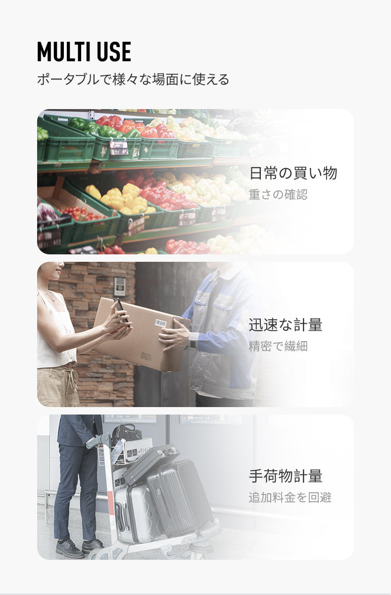 荷物が揺れたり、傾いたりすると正確な測定ができませんのでご注意ください。