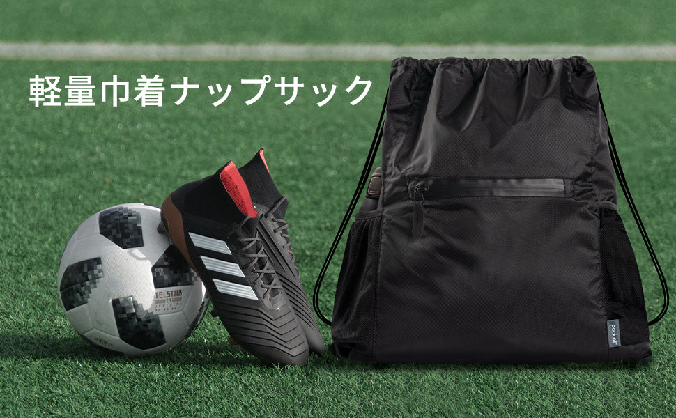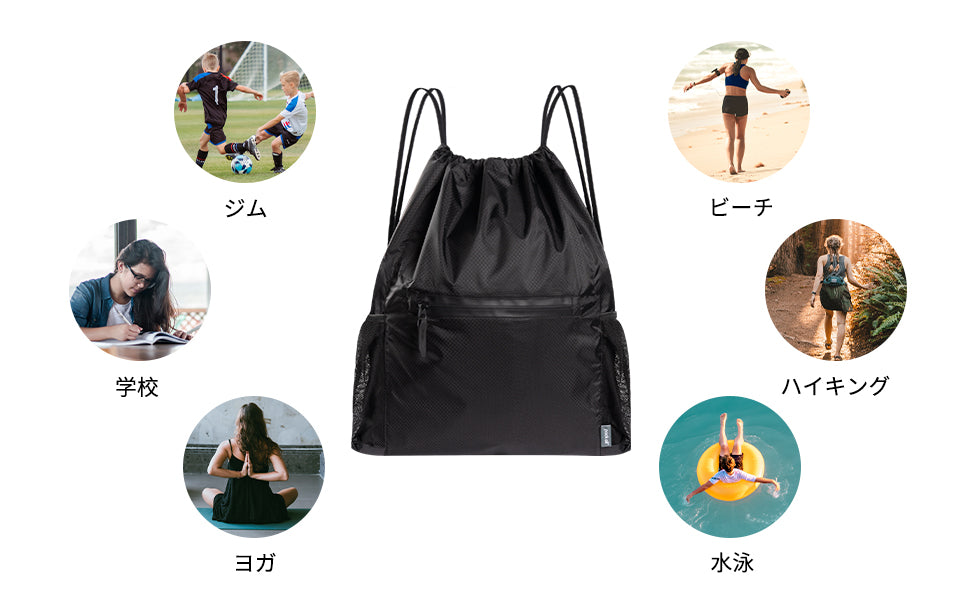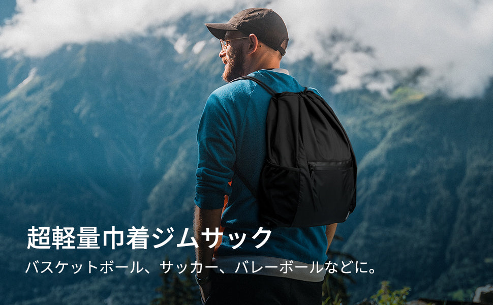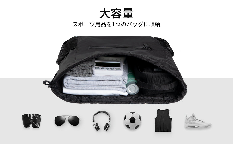 約20Lの容量を持つこのバッグは、ジムウェア一式、着替えとタオル、数冊の本、日常の買い物など、様々なアイテムを収納するのに十分なスペースを提供します。巾着タイプで開口部が大きく開くため、荷物の出し入れもスムーズです。