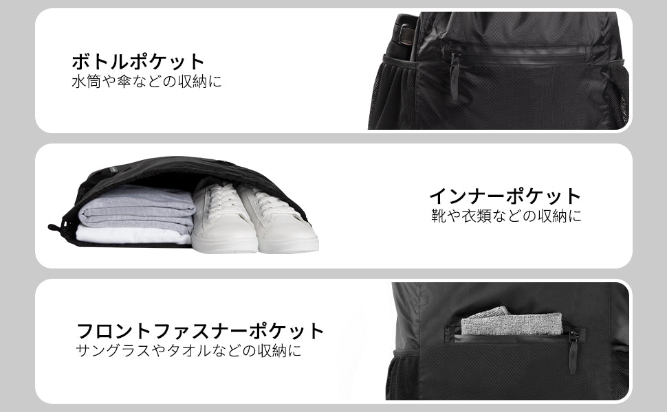 - 複数の収納スペースを備え、スポーツ用品の整理に最適。使用しない時は手のひらサイズにコンパクトに折りたたんで収納できるため、ジムや旅行、普段使いのサブバッグとして、必要な時にサッと取り出せる便利なアイテムです。