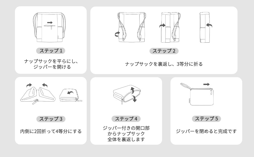 使用しない時は手のひらに収まるほどコンパクトに折りたたみ可能。メインバッグに入れて持ち運んだり、旅行先でのサブバッグとして、必要な時にサッと広げて活用できます。