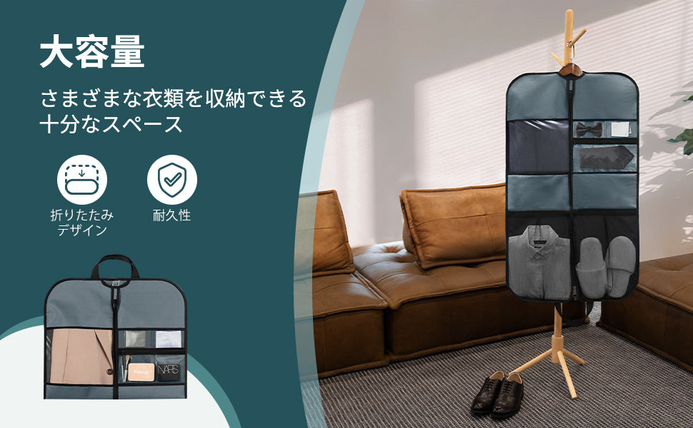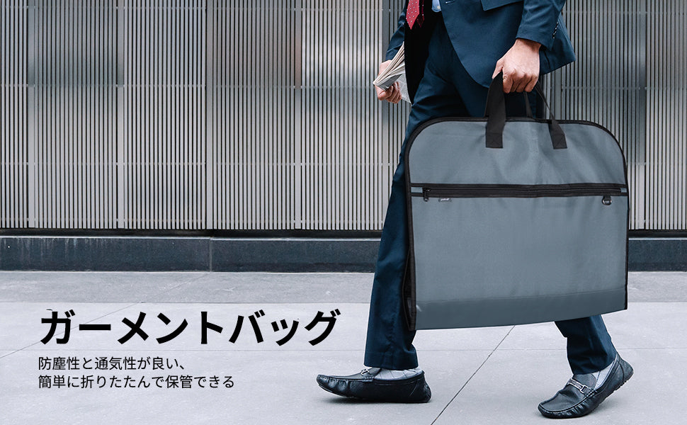 - 防水・防塵素材を採用しているため、移動中の予期せぬ水濡れやホコリから、あなたのビジネスウェアをしっかりと保護。軽量で折りたたみも可能なため、使わない時はコンパクトに収納でき、旅の荷物をより快適に、より効率的にします。