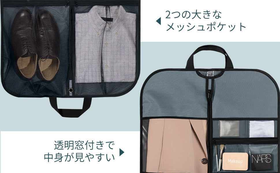 - 大容量ながら、スーツ1〜3着に加え、シャツやネクタイなどの小物もまとめて収納可能。透明窓付きデザインで、中身を素早く確認でき、必要な時に迷いません。