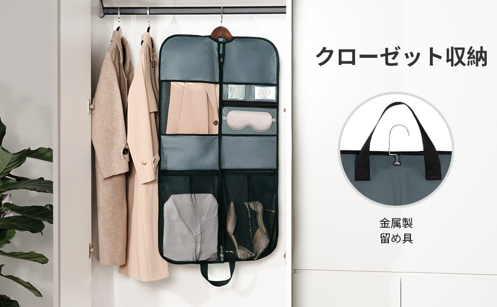 - 耐久性に優れたポリエステル素材を採用。軽量ながらも丈夫で、シワになりにくい特性を持ち、大切な衣類をしっかりと保護します。