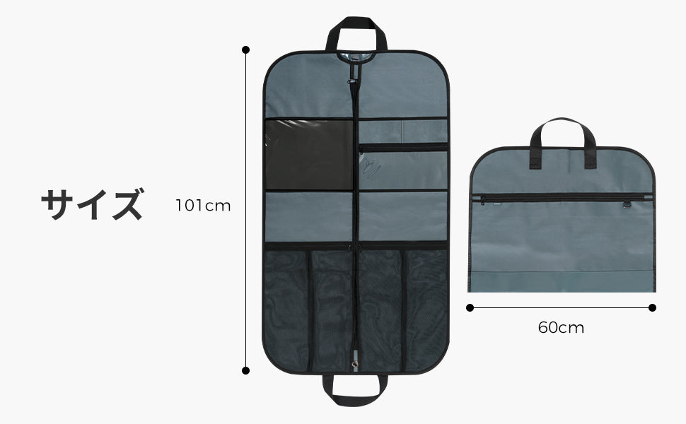 - 約101 x 60 cm。ゆとりのあるマチ付きデザインで、大切なスーツやドレスを複数枚(1〜3着)、シワになりにくく収納できます。
