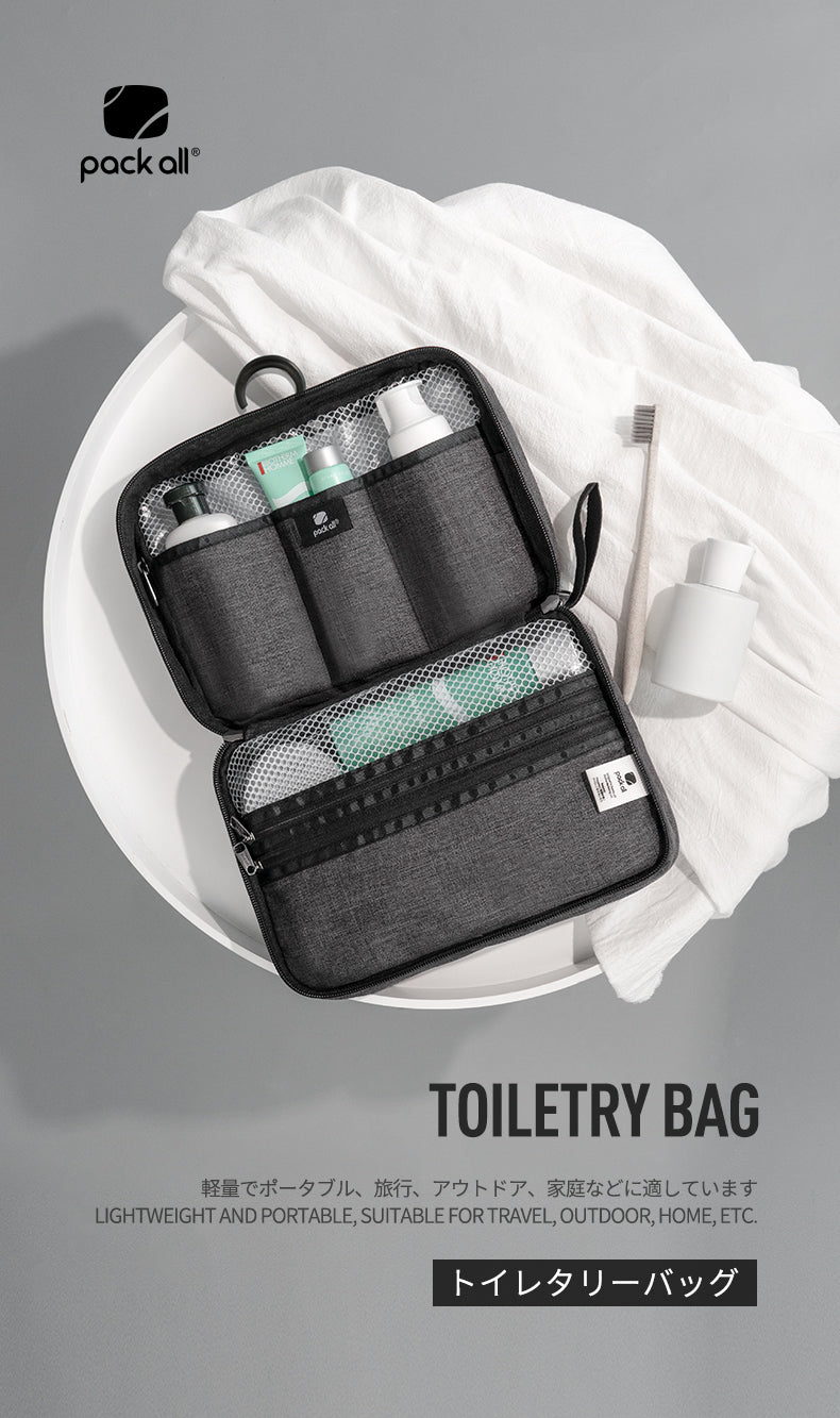 - この吊り下げ式トラベルポーチは、旅行や出張時に必要な洗面用具やコスメ、スキンケア用品などをスマートに整理・収納するために設計されました。