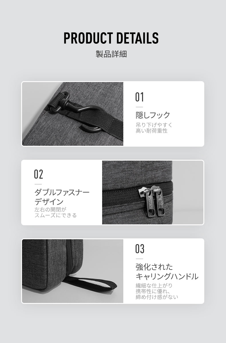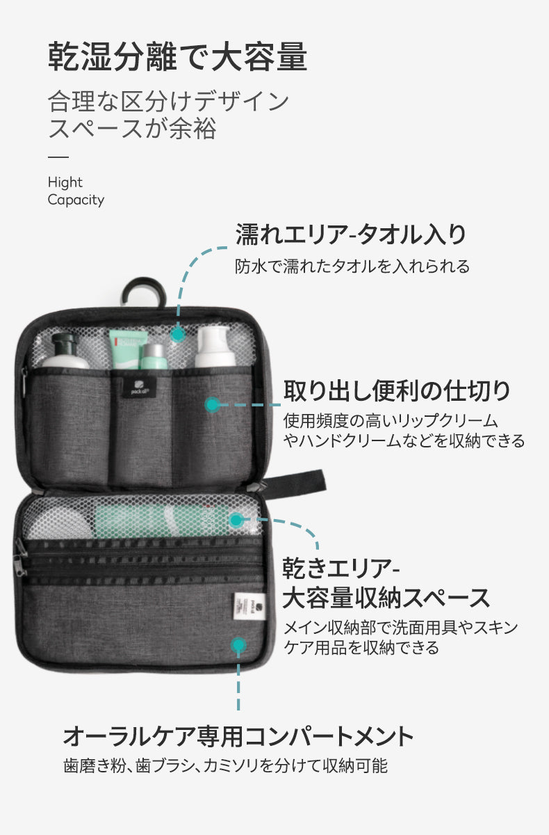 - 大容量の乾湿分離デザインにより、濡れたものと乾いたものを分けて衛生的に収納でき、内部は複数のポケットで中身が迷子になりません。また、便利な吊り下げフック付きで、フックにかければ洗面台が狭くてもサッと使え、ホテルのバスルームでも快適に身支度ができます。