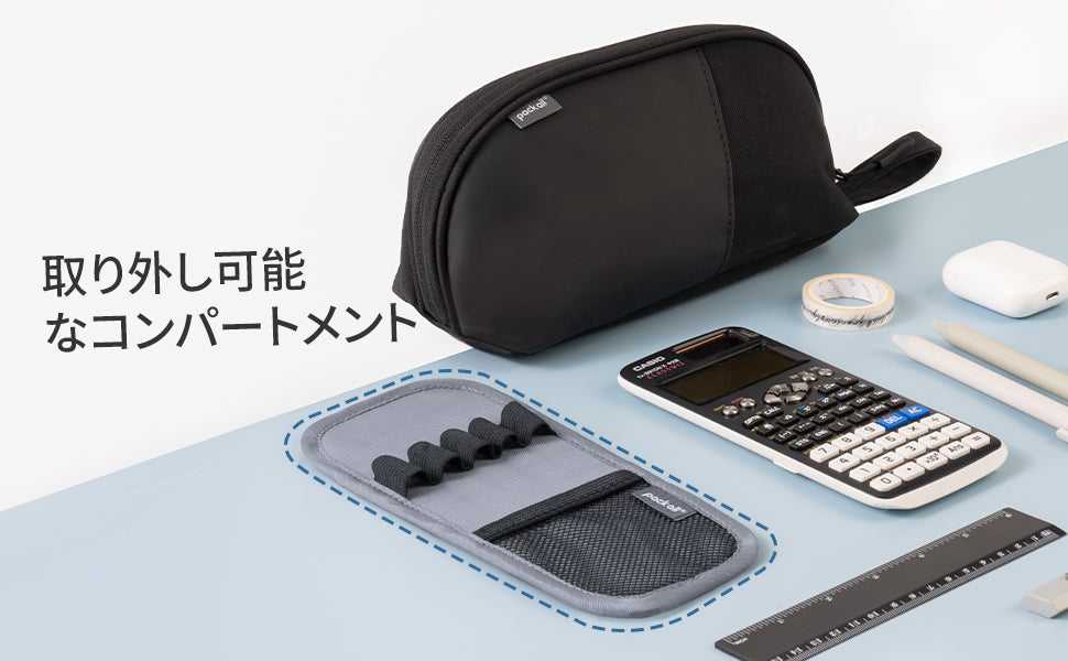 - 内部には取り外し可能な仕切り板と、ペンや消しゴムなどの小物をしっかり固定できるゴムバンドを完備。必要なアイテムを迷わずサッと取り出せる、機能的でスマートなペンケースです。