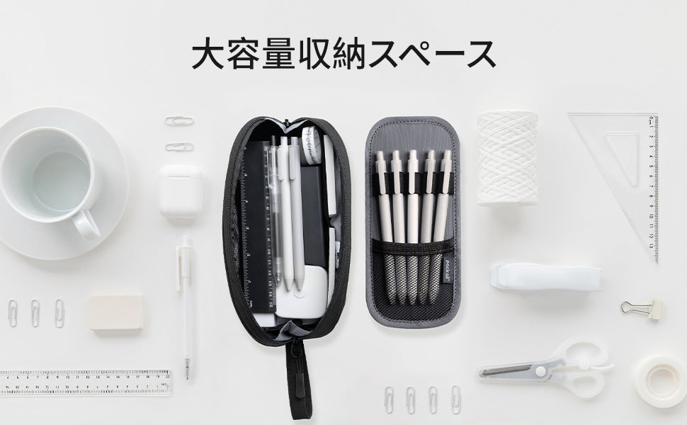 - この大容量多機能ペンケースは、筆記用具はもちろん、定規やハサミ、修正テープなど、かさばりがちな文房具類をまとめて整理・収納するために設計されました。
