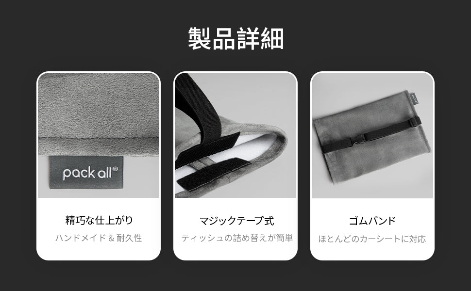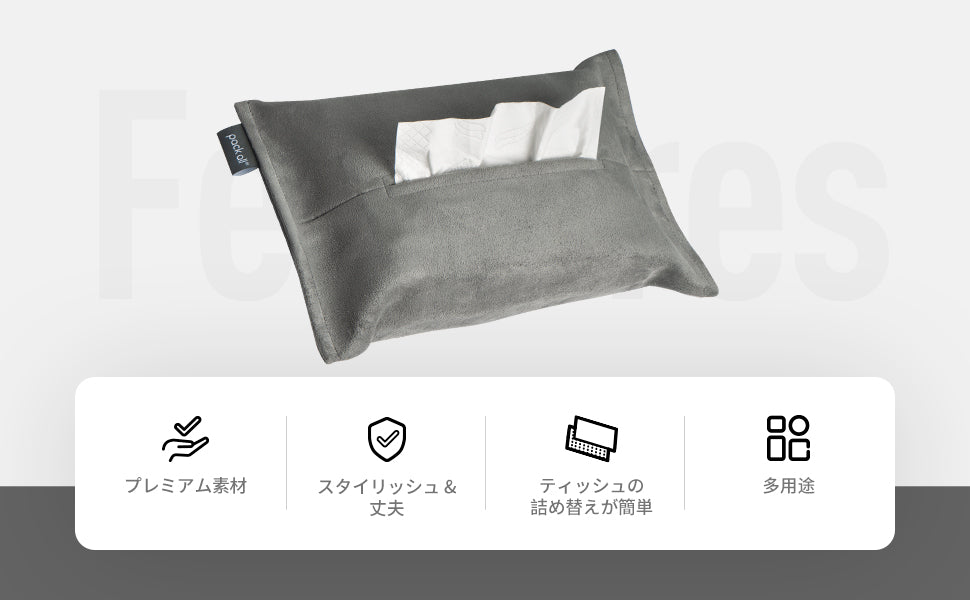 - 柔らかく耐久性のある素材は、お手入れも簡単で、日差しによる色褪せや嫌なニオイの心配もありません。簡単取り付けで、使いたい時にサッとティッシュを取り出せる、機能的でスマートな車内アクセサリーです。