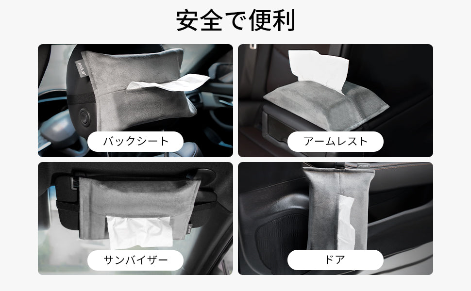 車内のティッシュペーパーをスマートに収納し、必要な時にサッと取り出せます。運転席周りや後部座席など、様々な場所に設置可能です。 -